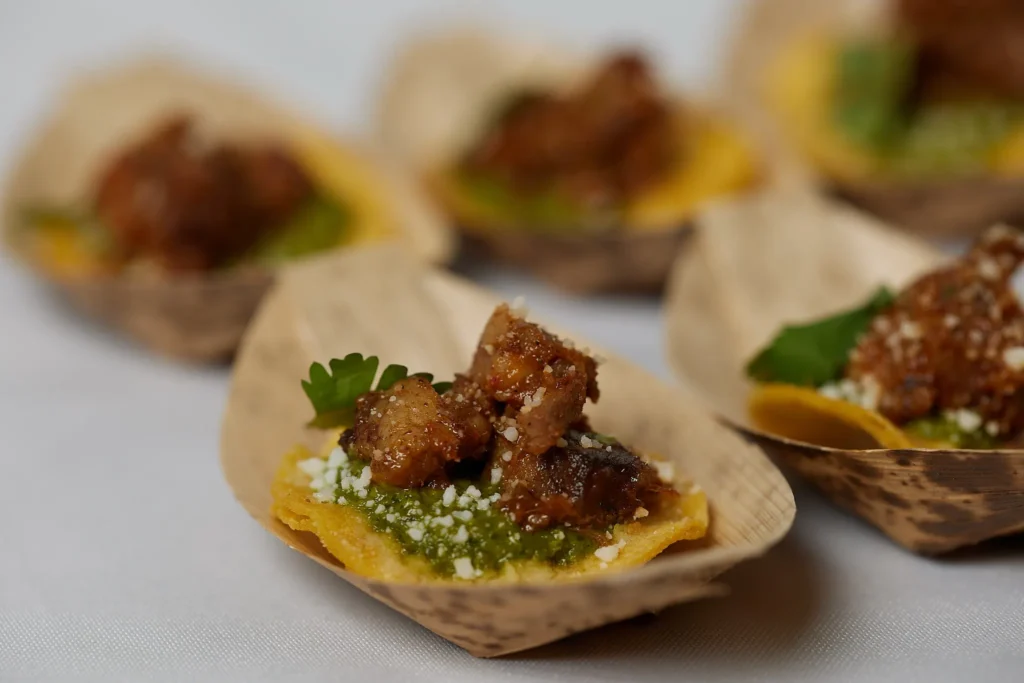 A creative way to stimulate your guests is to fuse familiar favorites with far away flavors. Pair Chicken Tikka Tacos with an ice cold Modelo, or a Korean Paella heavy on Gojuchang and a Makgeolli reduction. Introduce umami, aji Amarillo, and salted jalapeno honey to otherwise zest-free dishes like corned beef or roast chicken, or use them to turn barbeque short ribs up to an 11. The idea is to trick the eye and dazzle the taste buds with an unpredictable offering, engaging all the senses and leaving an indelible mark. Presented with international beer or wine, an imaginative menu conveys thoughtful intention for the diner’s experience.