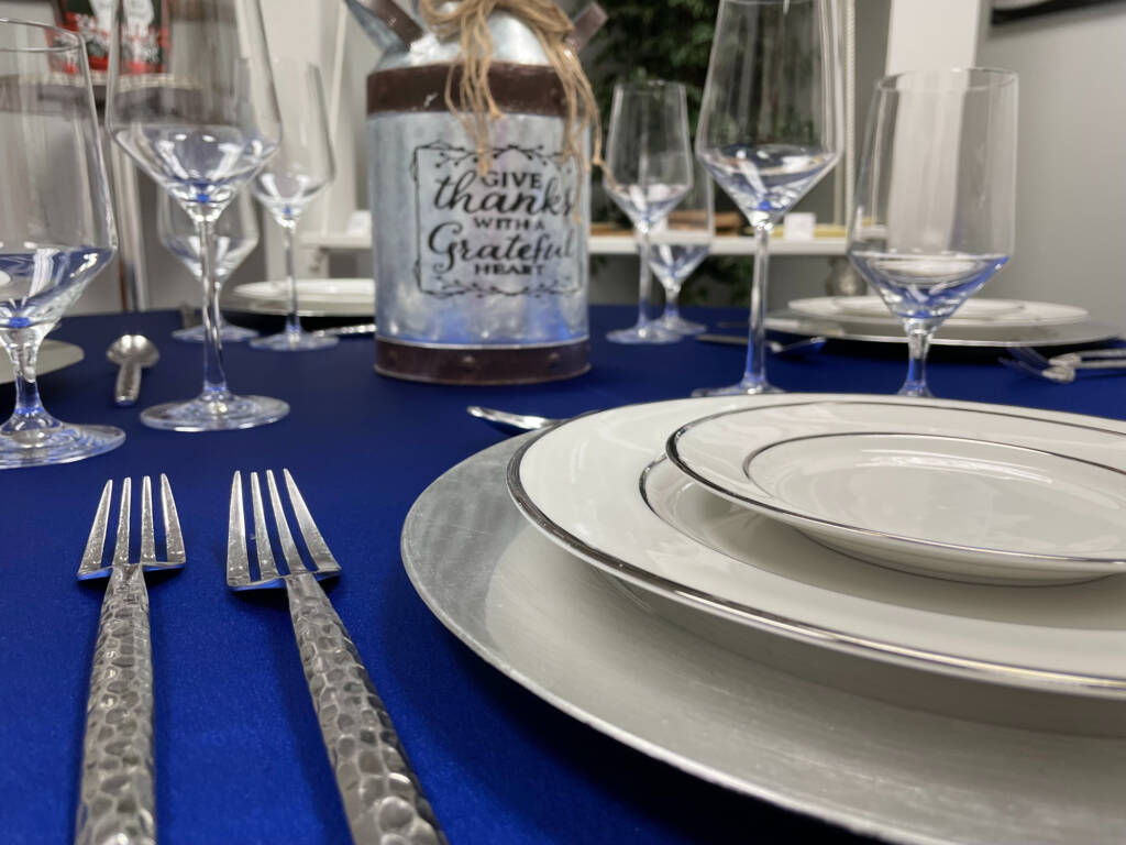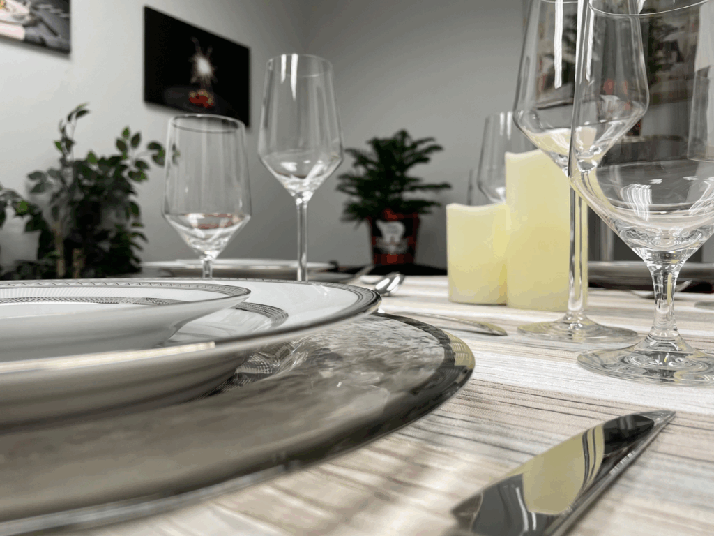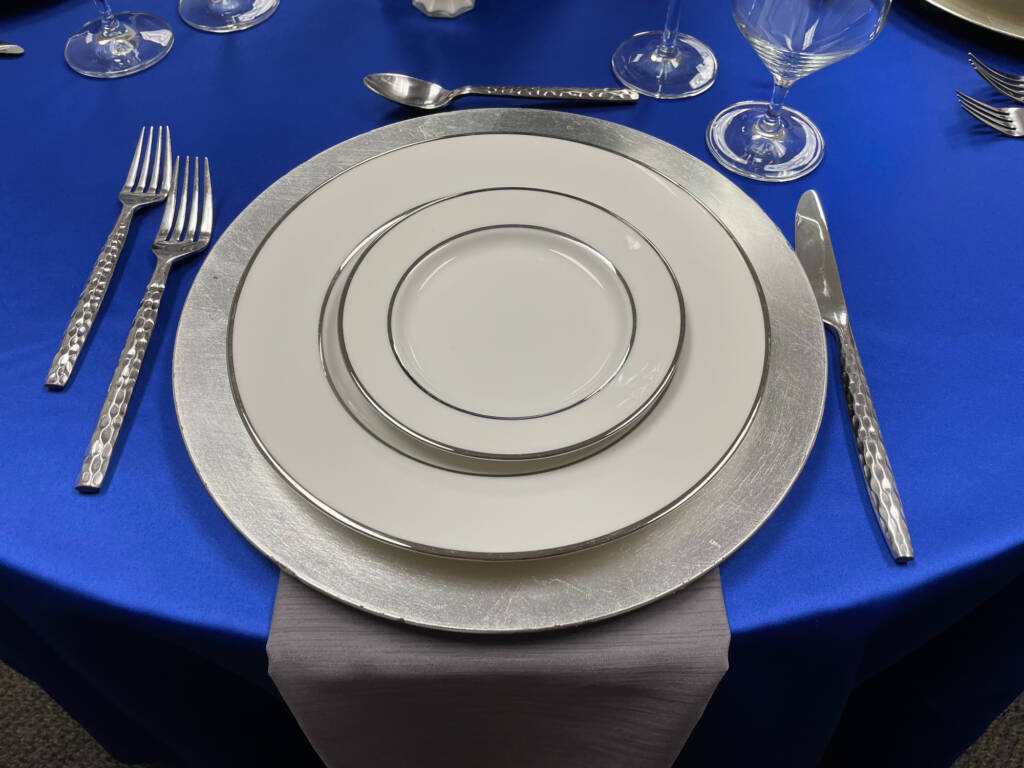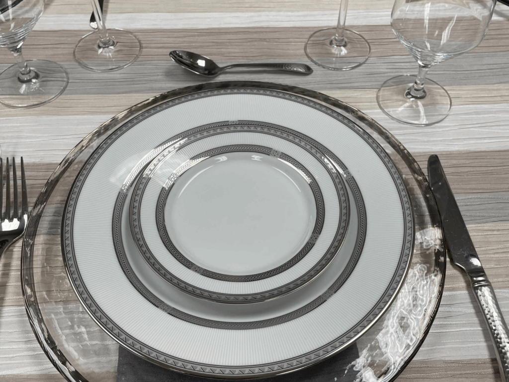 Silver Rimmed China | Pure Glassware | Hammer Forged Flatware | Silver Acrylic Charger | Royal Matt Lamour Tablecloth | Charcoal Shantung Napkin