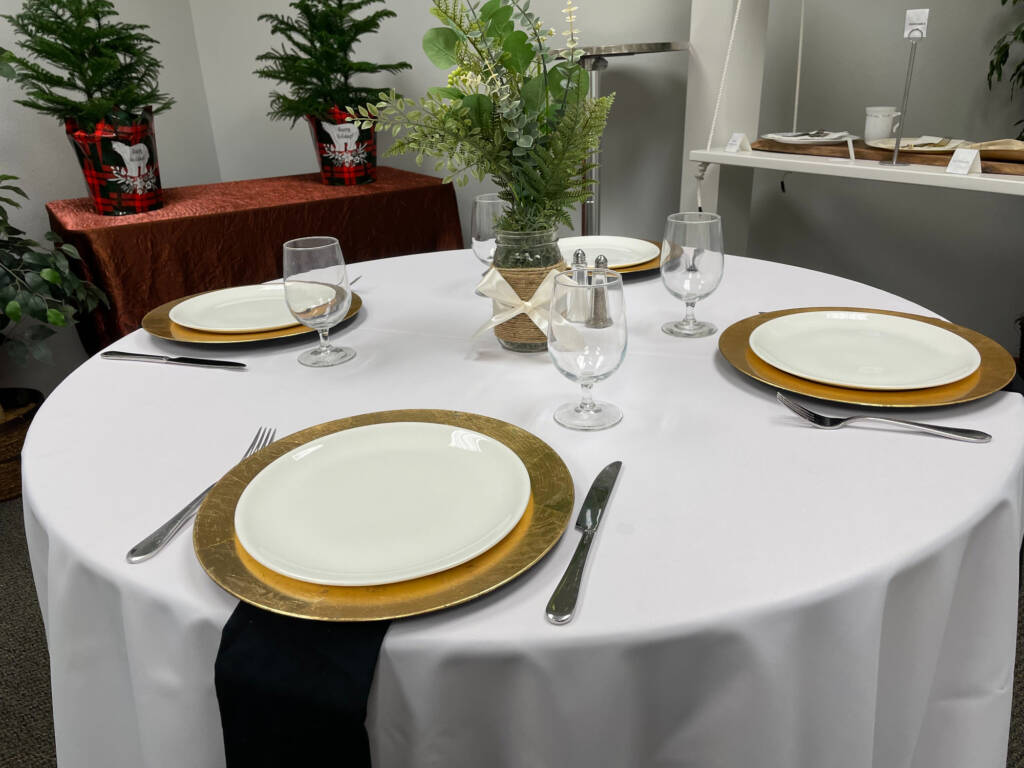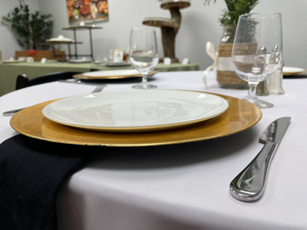 House China, Glassware and Flatware | Gold Acrylic Charger | Classic Solid White Tablecloth | Classic Solid Black Napkin